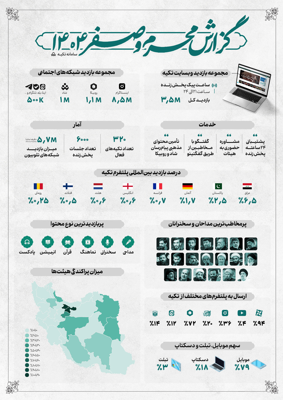 در این بازه زمانی، وب‌سایت «تکیه» به ثبت ۳.۵ میلیون بازدید کل دست یافت و میزبان بیش از ۶۰۰۰ جلسه پخش زنده مذهبی بود. این سامانه با ۳۲۰ تکیه فعال، به کانونی برای دسترسی آسان و یکپارچه به مراسم و محتوای دینی بدل شده است.
