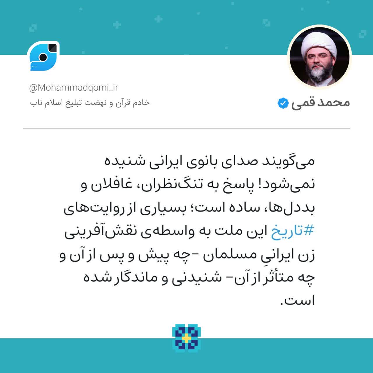 رئیس سازمان تبلیغات اسلامی در صفحه شخصی خود در شبکه اجتماعی ویراستی نوشت؛ می‌گویند صدای بانوی ایرانی شنیده نمی‌شود! پاسخ ساده است؛ بسیاری از روایت‌های تاریخ این ملت به واسطه‌ی نقش‌آفرینی زن ایرانیِ مسلمان شنیدنی و ماندگار شده است.