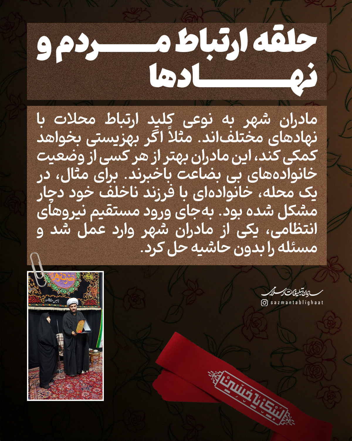 به گزارش روابط عمومی سازمان تبلیغات اسلامی، در شهر سهند آذربایجان شرقی، گروهی از بانوان خیر و باتجربه با نام «مادران شهر» نقشی کلیدی در حل مشکلات محلات ایفا می‌کنند. این طرح که به ابتکار حجت‌الاسلام حیدر مسن‌کر، رئیس اداره تبلیغات اسلامی سهند، شکل گرفته، مادران محلی را به حلقه‌ ارتباط میان مردم و نهادهای شهری تبدیل کرده است. از کمک به خانواده‌های نیازمند و مدیریت اعتکاف گرفته تا میانجی‌گری در مسائل اجتماعی؛ الگویی برای حکمرانی مردمی. در این شماره از نشریه دیجیتال از سهند و طرح مادران شهر می‌خوانیم.