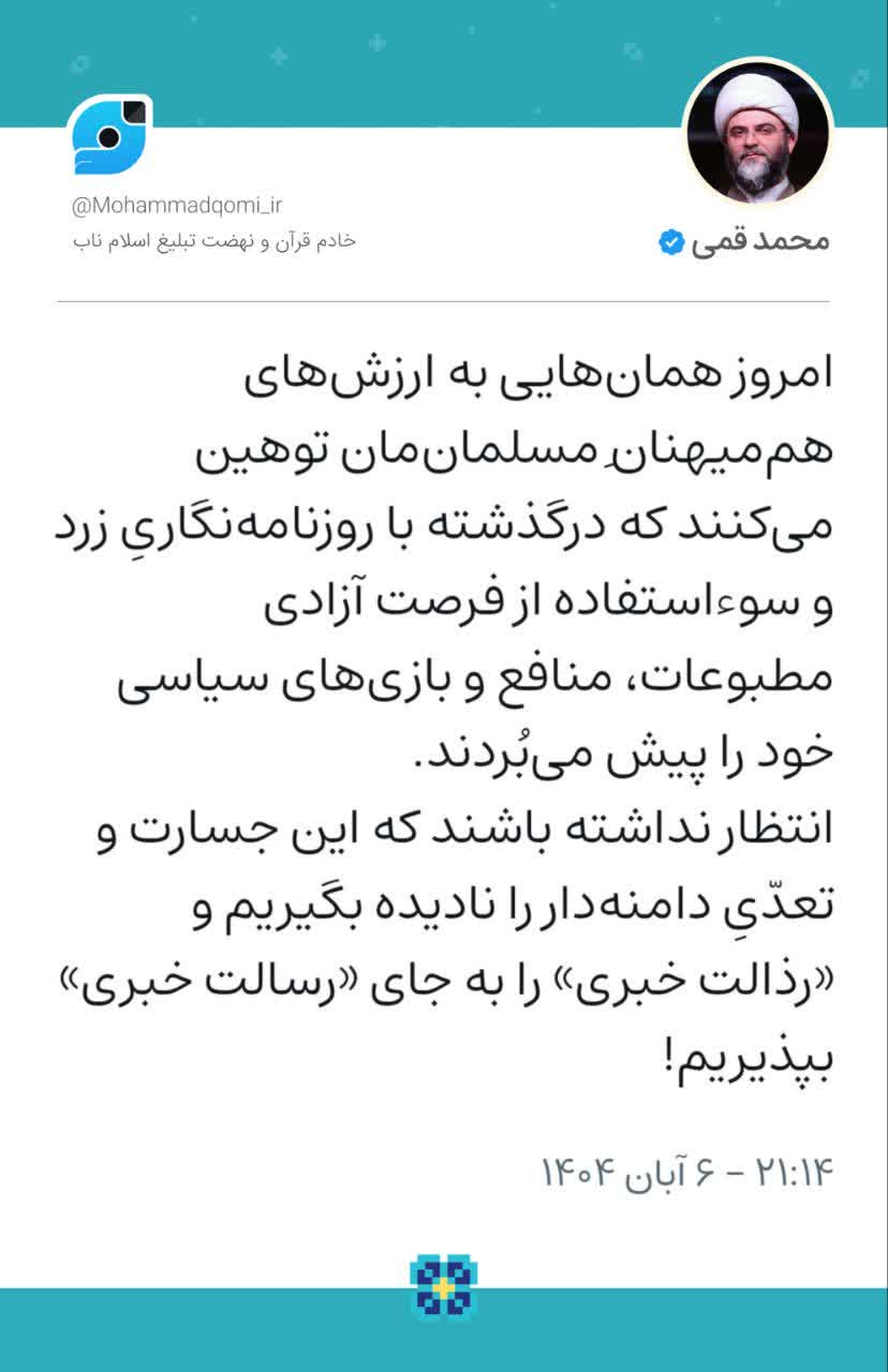 ۶ آبان | حجت‌الاسلام قمی در واکنش به حواشی روزنامه هم‌میهن نوشت؛