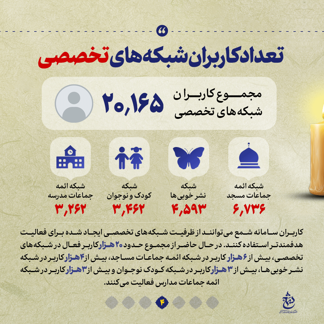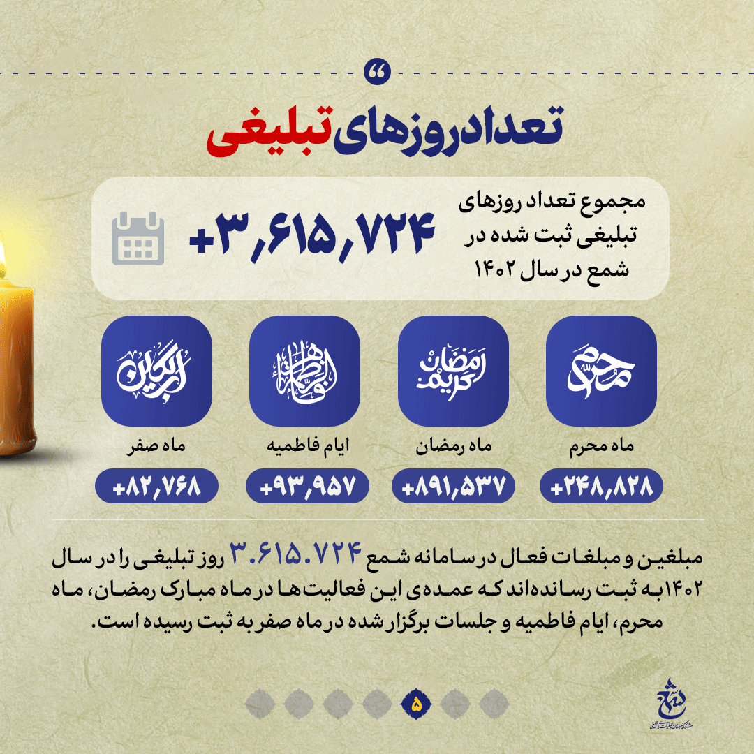 به گزارش روابط عمومی سازمان تبلیغات اسلامی، سامانه شمع به عنوان بزرگترین اطلس تبلیغی کشور پل ارتباطی میان مردم و مبلغین است که با هدف تسهیلگری جریان دعوت از سخنرانان مذهبی کشور و تحلیل و رصد عرصههای تبلیغی فعالیت میکند. در این شماره از نشریه دیجیتال نگاهی میاندازیم به سامانه شمع و برخی از اعداد و ارقام مرتبط به این سامانه را که این روزها بیش از پیش مورد توجه مبلغین و مبلغات، مسئولان فرهنگی و میزبانان مجالس مذهبی قرار گرفته است باهم مرور میکنیم.