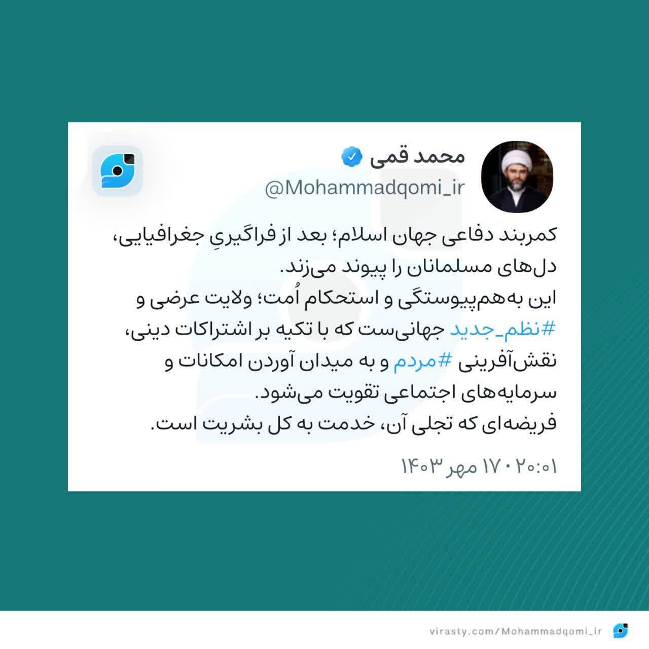 حجتالاسلام محمد قمی، رئیس سازمان تبلیغات اسلامی، درباره اتحاد جبهه مقاومت پیامی را در صفحه اجتماعی ویراستی منتشر کرد.