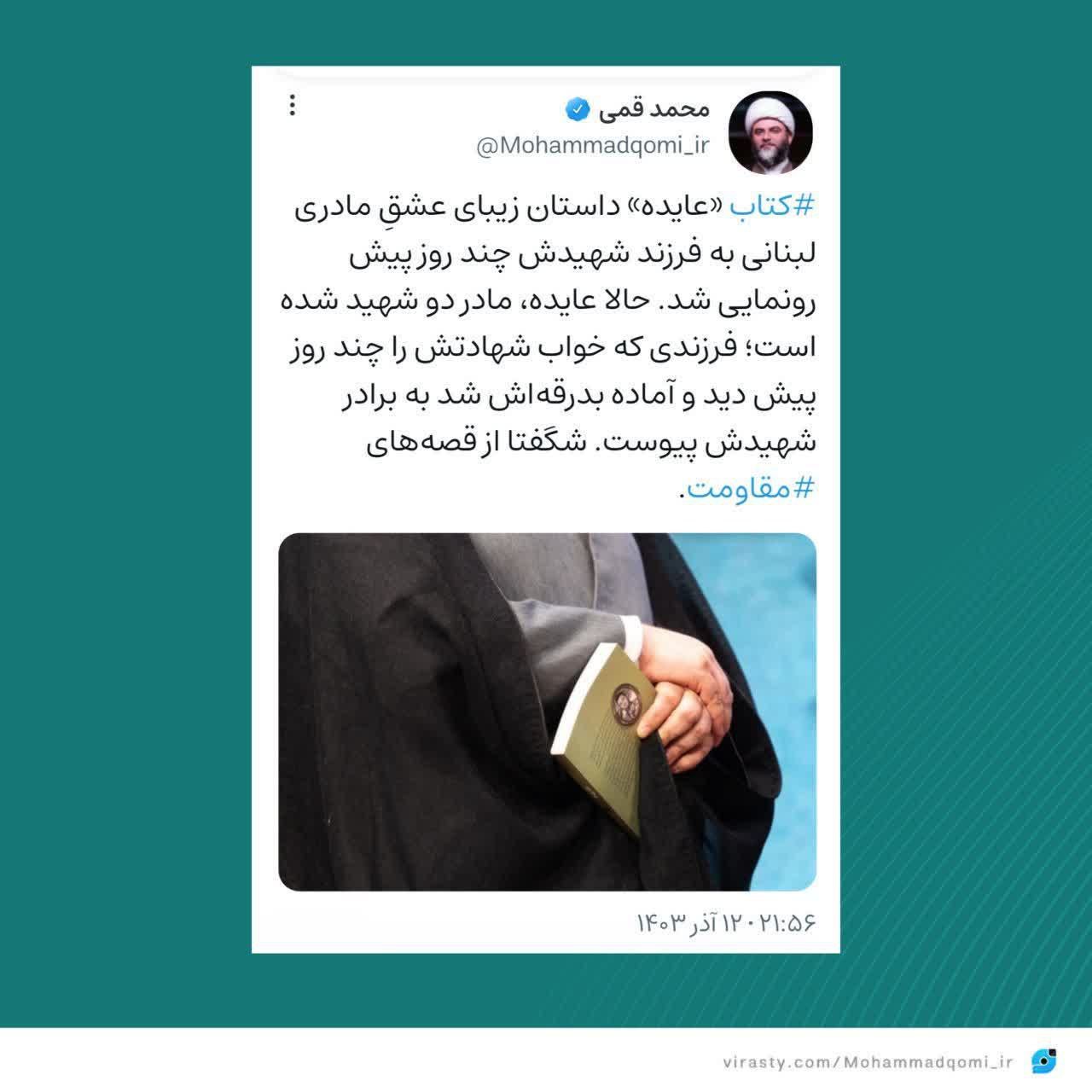 به گزارش روابط عمومی سازمان تبلیغات اسلامی، حجت الاسلام قمی، رئیس سازمان تبلیغات اسلامی در واکنش به رونمایی از کتاب عایده و وقایع پس از آن در شبکه اجتماعی ویراستی متنی منتشر کرد.