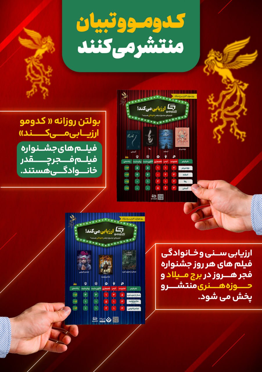 به گزارش روابط عمومی سازمان تبلیغات اسلامی، این روزها که در برج میلاد و بقیه سالنهای نمایش فیلمهای جشنواره فجر اکران میشود، تابلو و استندهایی ویژه کدومو برای ارزیابی مردمی فیلمهای جشنواره فیلم فجر نصب شده است.