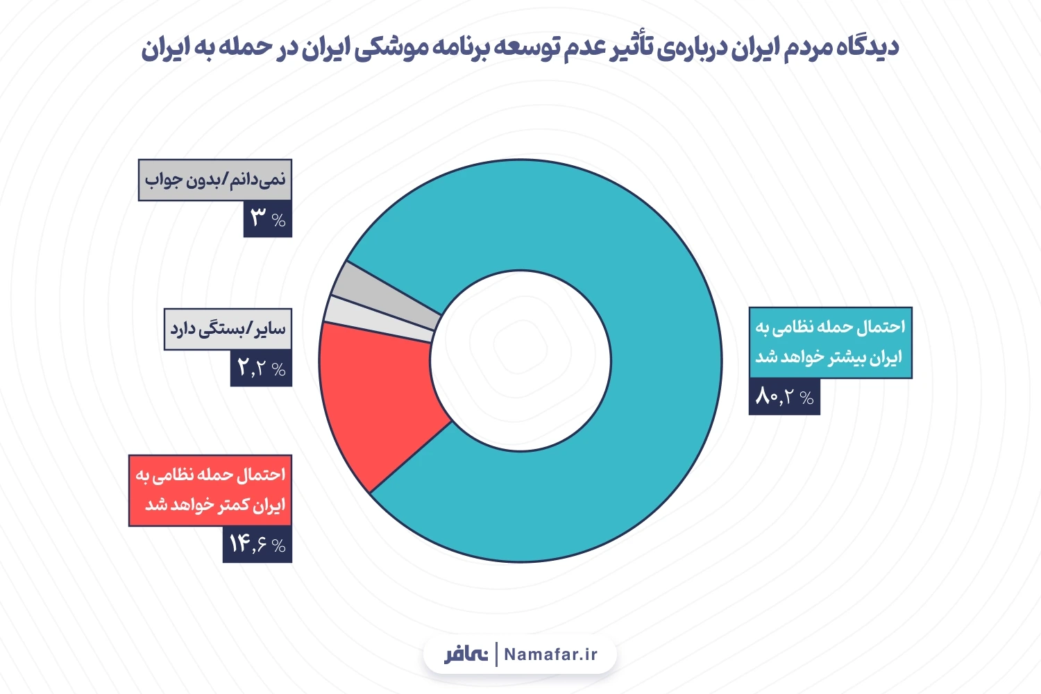 همواره نظرات و تحلیلهای مختلفی درباره برنامه موشکی ایران و توسعه آن، در افکار عمومی و رسانهها مطرح بوده است. برخی میگویند اگر ایران برنامه موشکی خود را توسعه ندهد، احتمال حمله نظامی به کشورمان بیشتر خواهد شد. زیرا که ایران در نگاه سایر کشورها ضعیف و بدون قدرت دفاعی تلقی میشود. در مقابل گروهی دیگر معتقدند که اگر ایران برنامه موشکی خود را توسعه ندهد، احتمال حمله نظامی کشورهای دیگر به ایران کمتر خواهد شد؛ زیرا در این صورت دیگر دلیلی برای ترس از ایران و حمله به آن وجود ندارد. واکاوی نظرات مردم در اینباره نشان میدهد که 80.2درصد آنها معتقدند که اگر ایران برنامه موشکی خود را توسعه ندهد، احتمال حمله نظامی به کشورمان بیشتر شده و موافق توسعه برنامه موشکی ایران هستند. این در حالی است که در سوی مقابل، 14.6درصد پاسخگویان، میگویند عدم توسعه برنامه موشکی ایران احتمال حمله به کشورمان را کم میکند. این همراهی 80درصدی در پیش از جنگ 12 روزه، حدود 70درصد بوده است؛ علت اصلی تغییر جدی و افزایش نزدیک به اشباع در رابطه با امنیت ساز بودن توان موشکی ایران، مشخصاً خود جنگ تحمیلی 12 روزه و کارایی موشکهای ایرانی در پاسخگویی به حملات دشمن است. همچنین سرنوشت کشورهای همسایه مانند سوریه، حتی پس از توافق با آمریکا و حملات اسرائیل در روزهای اخیر به خاک سوریه و ناتوانی آنها در پاسخ و دفاع از خود نیز میتواند باعث افزایش حمایت از برنامه موشکی در آینده نیز شود.